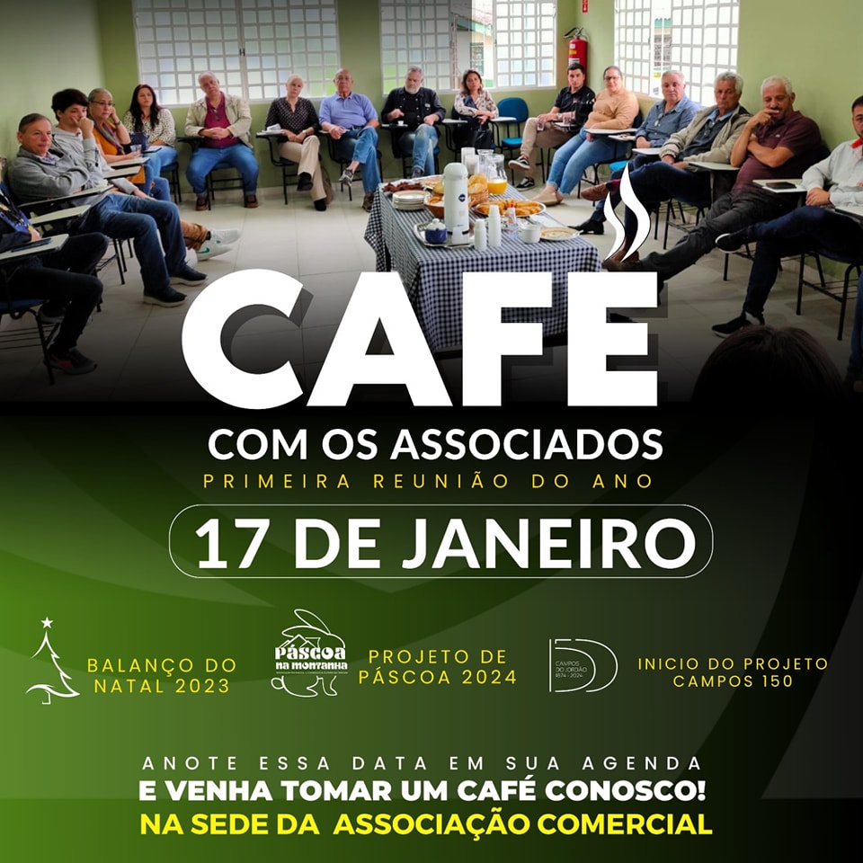 A Associação Comercial e Empresarial de Campos do Jordão convida todos associados para o 1° Café com os associados de 2024 aqui na sede da ACE no dia 17 de Janeiro a partir das 9h.