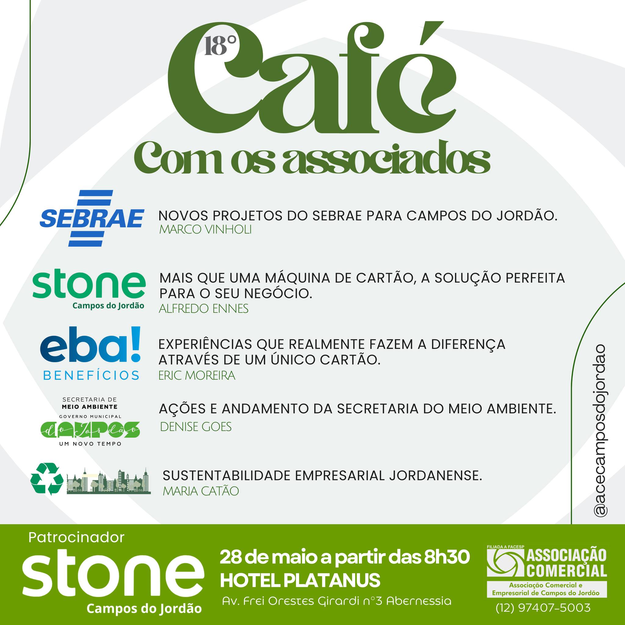 Este café com os associados é patrocinado pela empresa associada Stone Campos do Jordão. Venha fortalecer nossa associação e traga um amigo de uma empresa que ainda não seja associada para compartilhar este momento enriquecedor!