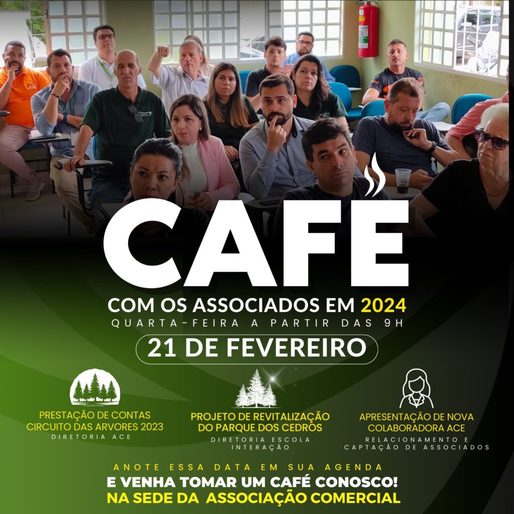A Associação Comercial e Empresarial de Campos do Jordão convida todos associados para o nosso 2° Café com os associados de 2024 aqui na sede da ACE no dia 21 de Fevereiro a partir das 9h. Até breve! Confirme sua presença conosco diretamente pelo WhatsApp: 12 97407-5003