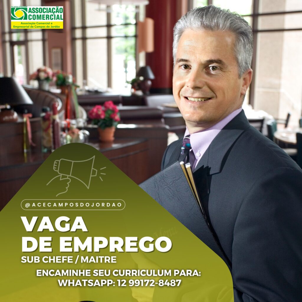Empresa Associada contrata: CASA ALEMÃ DE CAMPOS DO JORDÃO Vaga de : SUB CHEFE / MAITRE Carga horária: 44h semanais Requisitos: Proativo Dinâmico Boa comunicação Disponibilidade de horário Graduado na área Benefício : Carteira Assinada – inicio imediato Vale Alimentação Convênio Médico e Odontológico Salário dentro da categoria Você se enquadra nesta vaga? Então mande […]