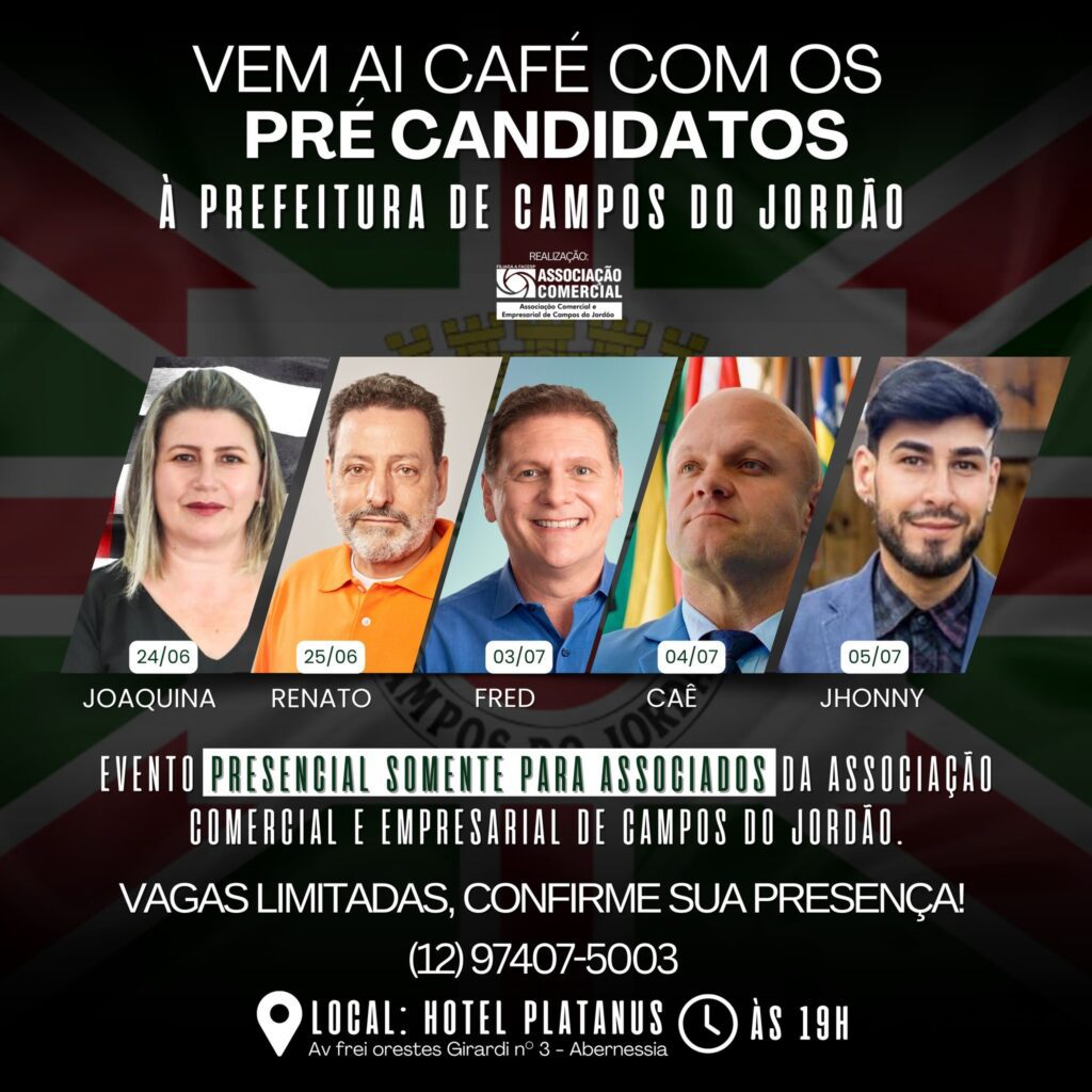 Associado, sua presença é essencial! Participe presencialmente do café com os pré-candidatos à prefeitura de Campos do Jordão. Esta é uma oportunidade única para conhecer suas propostas. Contamos com você! Confirme sua presença conosco no contato: (12) 97407-5003 (Vagas Limitadas)