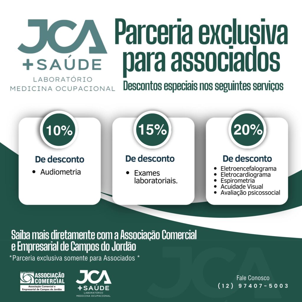 Associado, aproveite os benefícios exclusivos da @jcamaissaude ! A Associação Comercial e Empresarial de Campos do Jordão tem o prazer de anunciar uma parceria especial com o JCA + Saúde Laboratório Medicina Ocupacional. Esta parceria oferece descontos exclusivos para nossos associados em diversos serviços de saúde. Descontos especiais para você: 10% de desconto em Audiometria […]