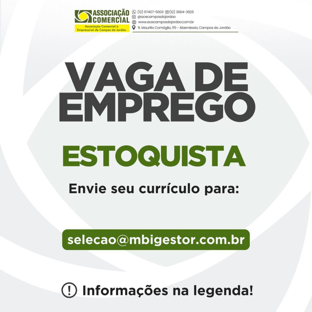 Empresa associada: Serrana Auto Peças ESTÁ CONTRATANDO Vaga de: ESTOQUISTA Requisitos: ENSINO MÉDIO COMPLETO NOÇÕES BÁSICAS DE EXCEL BOA COMUNICAÇÃO E PROATIVIDADE ATENÇÃO AOS DETALHES E ORGANIZAÇÃO DIFERENCIAL: CONHECIMENTO EM ROTINAS FISCAIS EXPERIÊNCIA NO ESTOQUE OU ALMOXARIFADO Você se enquadra nesta vaga? Então mande seu currículo atualizado para o E-mail: selecao@mbigestor.com.br Atenção: Os interessados na […]