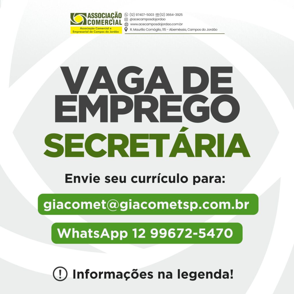 Empresa associada: Giacomet Campos ESTÁ CONTRATANDO Vaga de: Secretária Requisitos: 1. Formação: – Ensino médio completo (mínimo) – Desejável curso técnico ou superior em Administração, Contabilidade, Secretariado ou áreas correlatas 2. Habilidades técnicas: – Pacote Office (Word, Excel, Outlook) – Redação e comunicação escrita – Organização de agendas e compromissos – Atendimento telefônico e presencial […]