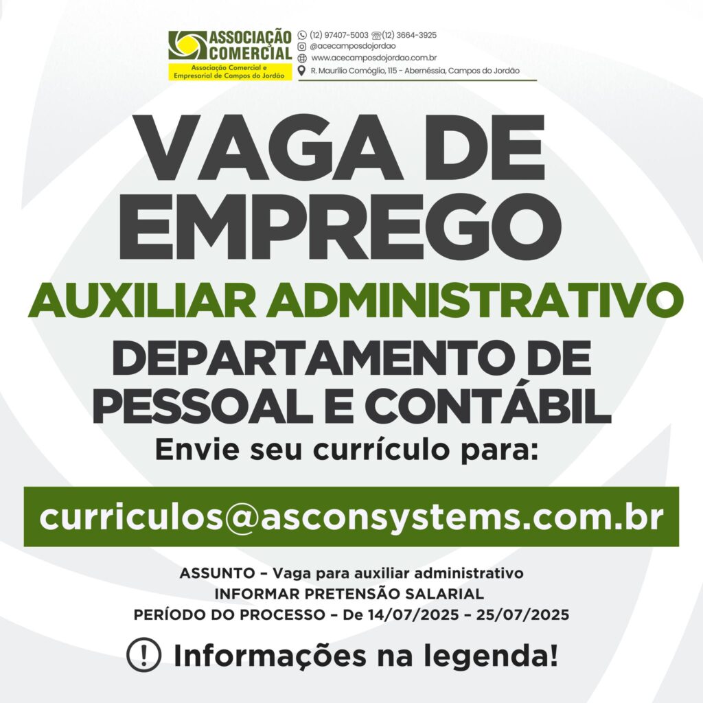 Empresa associada: ASCON SYSTEMS ESTÁ CONTRATANDO Vaga de: Auxiliar Administrativo / Departamento de pessoal e contábil Requisitos: REMUNERAÇÃO – Conforme perfil CONHECIMENTOS NECESSÁRIOS – Básico Word, Excel e boa digitação HABILIDADES NECESSÁRIAS – Facilidade de aprendizado, boa comunicação, afinidade com o trabalho administrativo, capacidade de manter o foco na atividade realizada, boa redação BENEFÍCIOS – […]