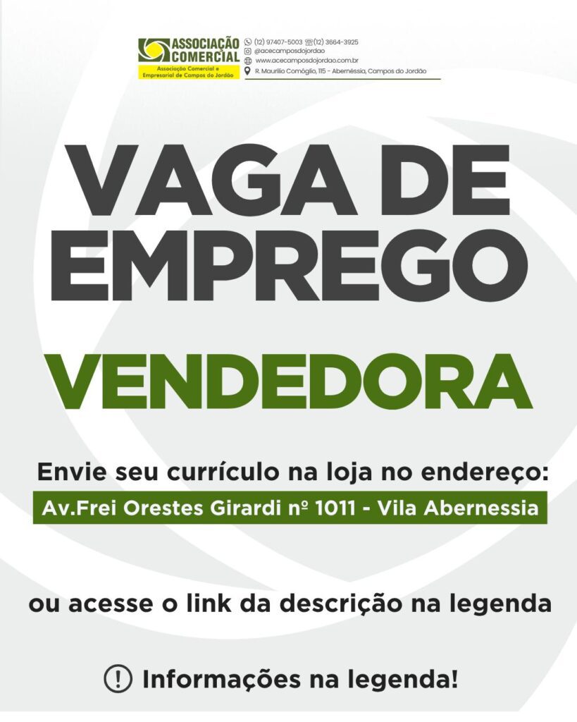 Empresa associada: Goldfinger ESTÁ CONTRATANDO Vaga de: Vendedora Requisitos: experiência comprovada em vendas habilidades de comunicação habilidades de negociação e persuasão paixão por jóias paixão pelo universo da moda – relógios e ótica Você se enquadra nesta vaga? Então mande seu currículo atualizado para a Goldfinger no endereço Av.Frei Orestes Girardi nº 1011 – Vila […]