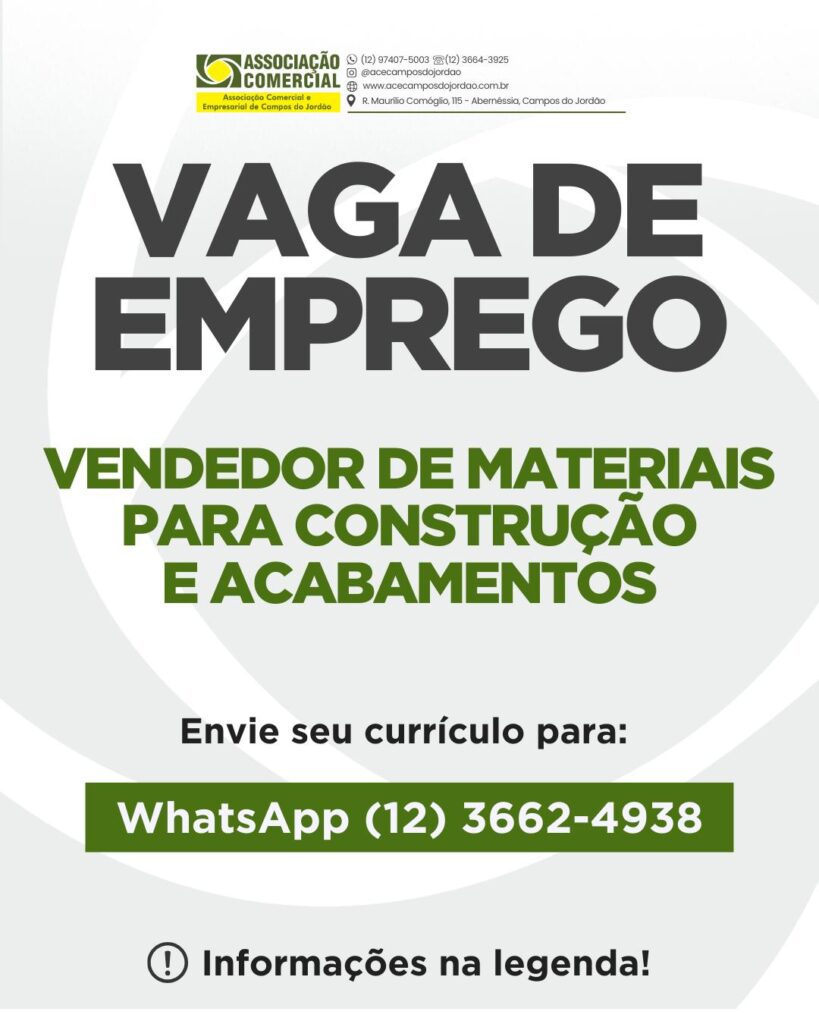 Empresa associada: Deposito Oliveira ESTÁ CONTRATANDO Vaga de: vendedor de materiais para construção e acabamentos Requisitos: • Idade mínima: 18 anos; • Ensino médio completo (desejável); • Boa comunicação e simpatia no atendimento; • Comprometimento, responsabilidade e pontualidade; • Experiência em vendas será um diferencial, principalmente no ramo de materiais de construção ou acabamentos. Oferecemos: […]