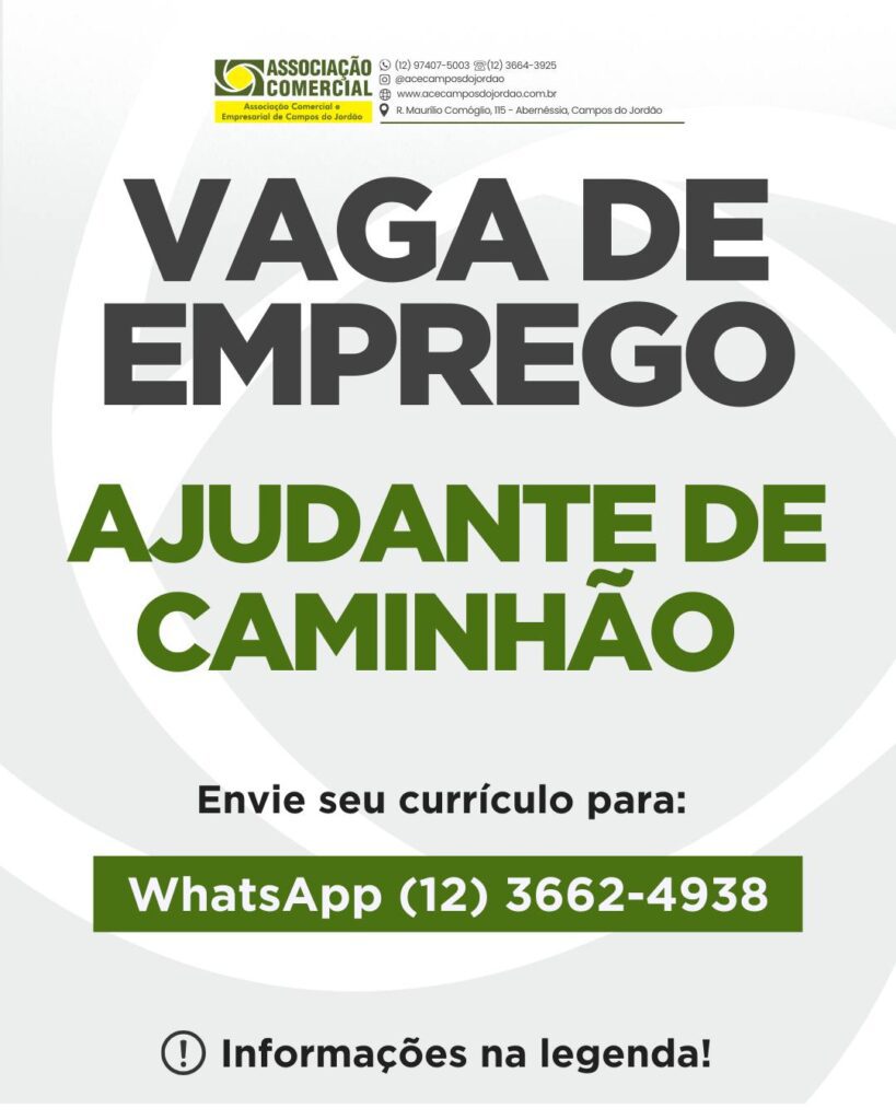 Empresa associada: Deposito Oliveira ESTÁ CONTRATANDO Vaga de: Ajudante de caminhão Requisitos: Idade mínima: 18 anos; .Ensino fundamental (desejável); .Boa disposição física; .Comprometimento, responsabilidade e pontualidade; .Disponibilidade de horários; .Experiência na função será um diferencial, mas não é obrigatória. Oferecemos: .Horário de trabalho: segunda a sexta das 8:00 às 18:00 com intervalo de 1:30 de […]