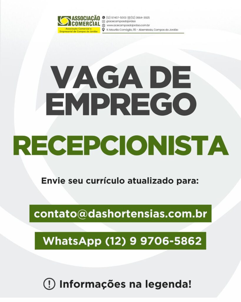 Empresa associada: Pousada das Hortênsias ESTÁ CONTRATANDO Vaga de: RECEPCIONISTA Requisitos: Respeito Pontualidade Responsabilidade – Salário R$2300,00 – R$430 de cesta básica – vale transporte – vale refeição – plano odontológico com mais 1 dependente – telemedicina – 1 folga na semana e 1 domingo de folga no mês. – Horário das 14:40 às 23h […]