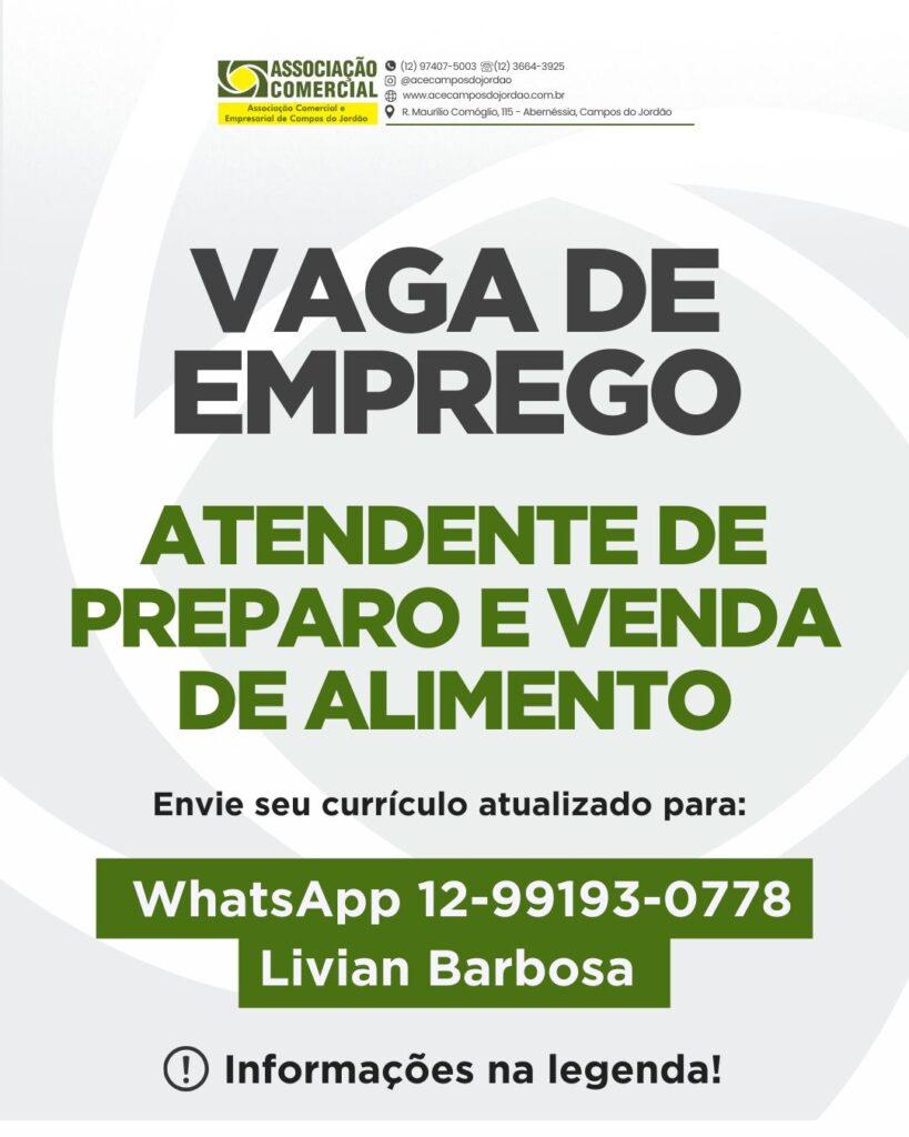 CIA ALIMENTOS CAPIVARI LTDA ESTÁ CONTRATANDO Vaga: ATENDENTE DE PREPARO E VENDA DE ALIMENTO Requisitos: Acima de 18 anos Ensino médio completo ou cursando Boa apresentação pessoal e comunicação verbal Dinamismo e agilidade no atendimento e preparo dos alimentos Respeito a pares e superior hierárquico Atento à regras e procedimentos das empresa e do Parque […]