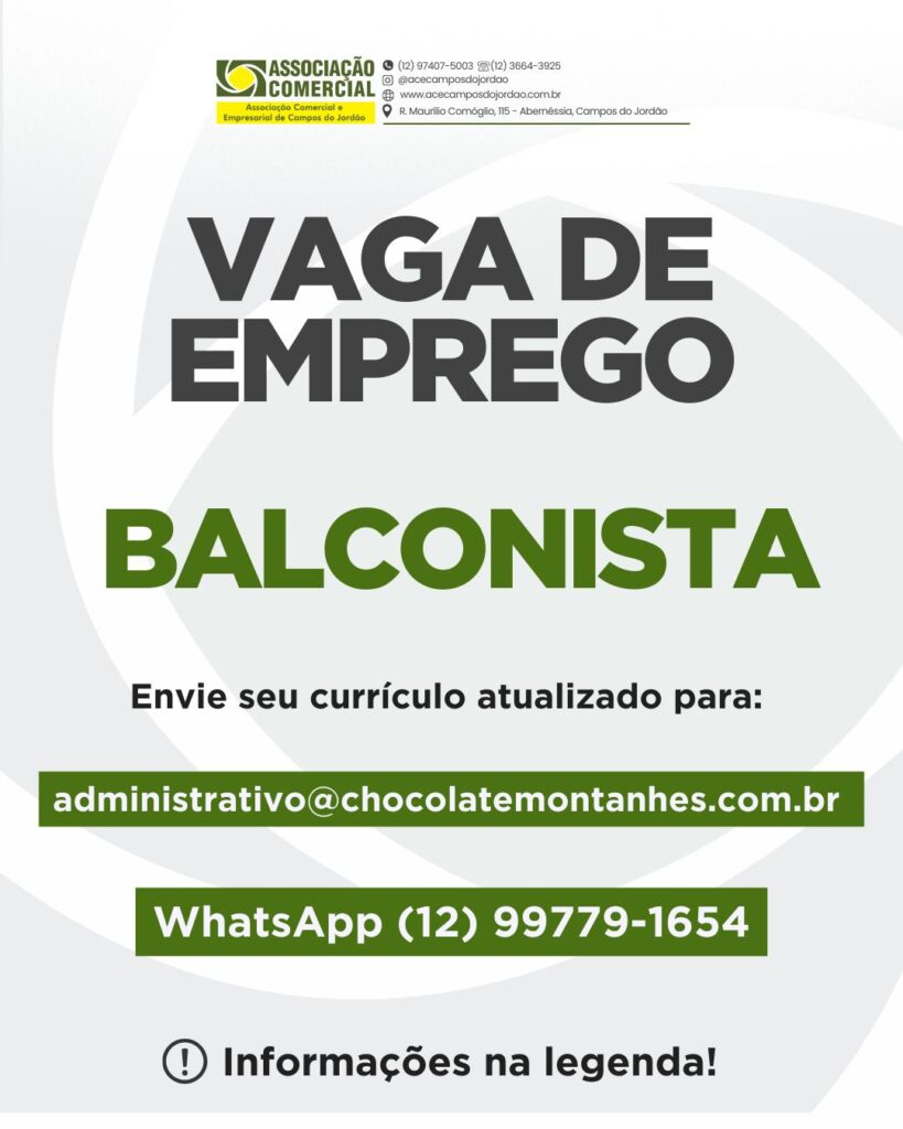 Empresa associada: Chocolate Montanhês ESTÁ CONTRATANDO Vaga de: Balconista Requisitos: maior de 18 anos Carga horária de 44horas semanais, folga de acordo com escala Você se enquadra nesta vaga? Então mande seu currículo atualizado para o E-mail: administrativo@chocolatemontanhes.com.br ou pelo whats 12 99779-1654 Atenção: Os interessados na Vaga deve entrar em contato diretamente com a […]