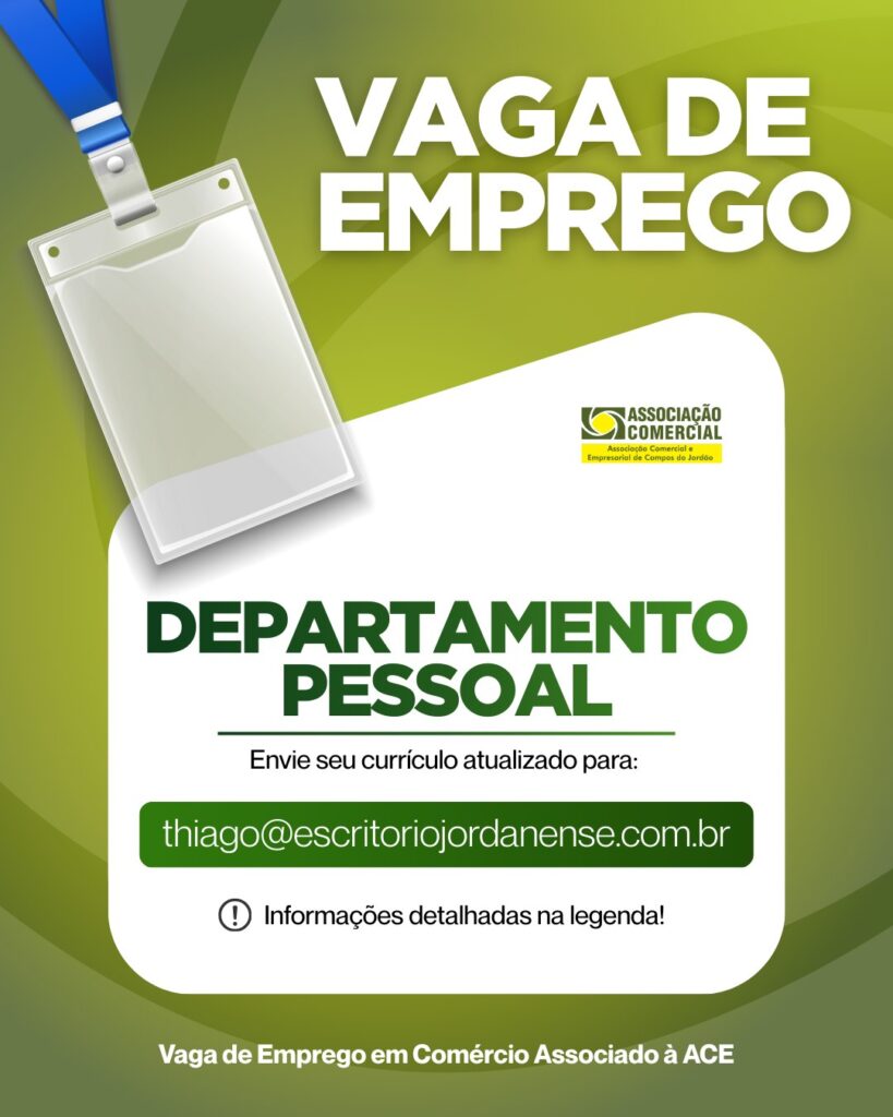 Empresa associada: ESCRITÓRIO JORDANENSE Vaga de: DEPARTAMENTO PESSOAL Requisitos: Vaga Feminina Maior de 18 anosConhecimento na rotina do Departamento Pessoal, incluindo fechamento de folha de pagamento, emissão de holerites, processos de admissão e demais atividades pertinentes à função. Você se enquadra nesta vaga? Então mande seu currículo atualizado para o E-mail: thiago@escritoriojordanense.com.br Atenção: Os interessados […]