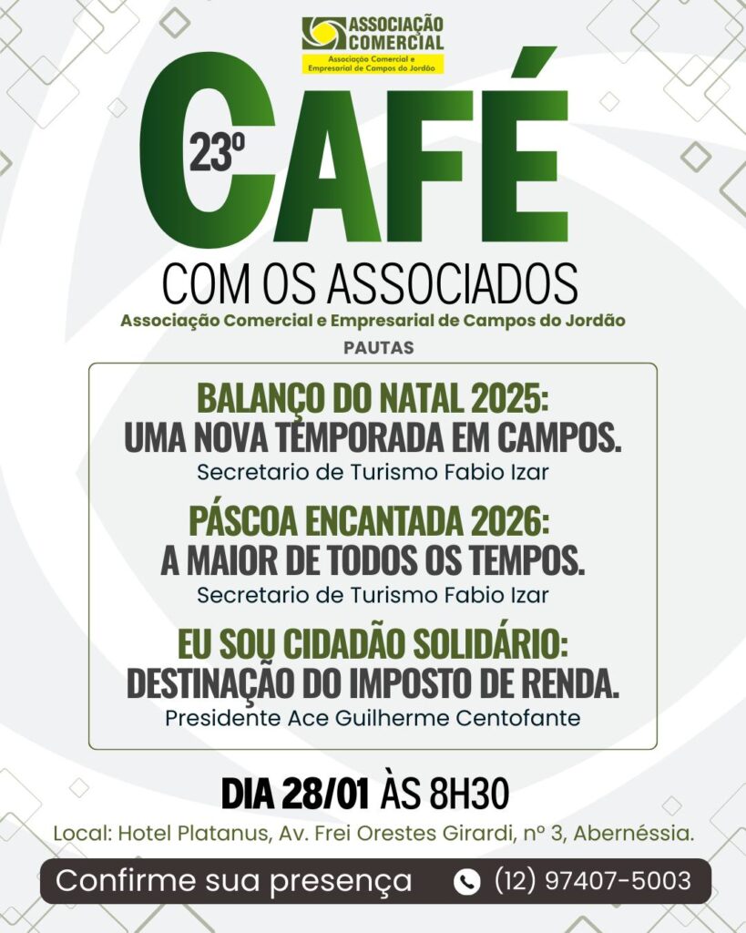 A Associação Comercial e Empresarial de Campos do Jordão tem o prazer de convidar todos os associados para o 1º Café com os Associados de 2026 – 23ª Edição! Nesta edição, abordaremos temas importantes para o crescimento de nossa cidade e do seu negócio: Balanço do Natal 2025: Uma Nova Temporada em CamposCom o Secretário […]