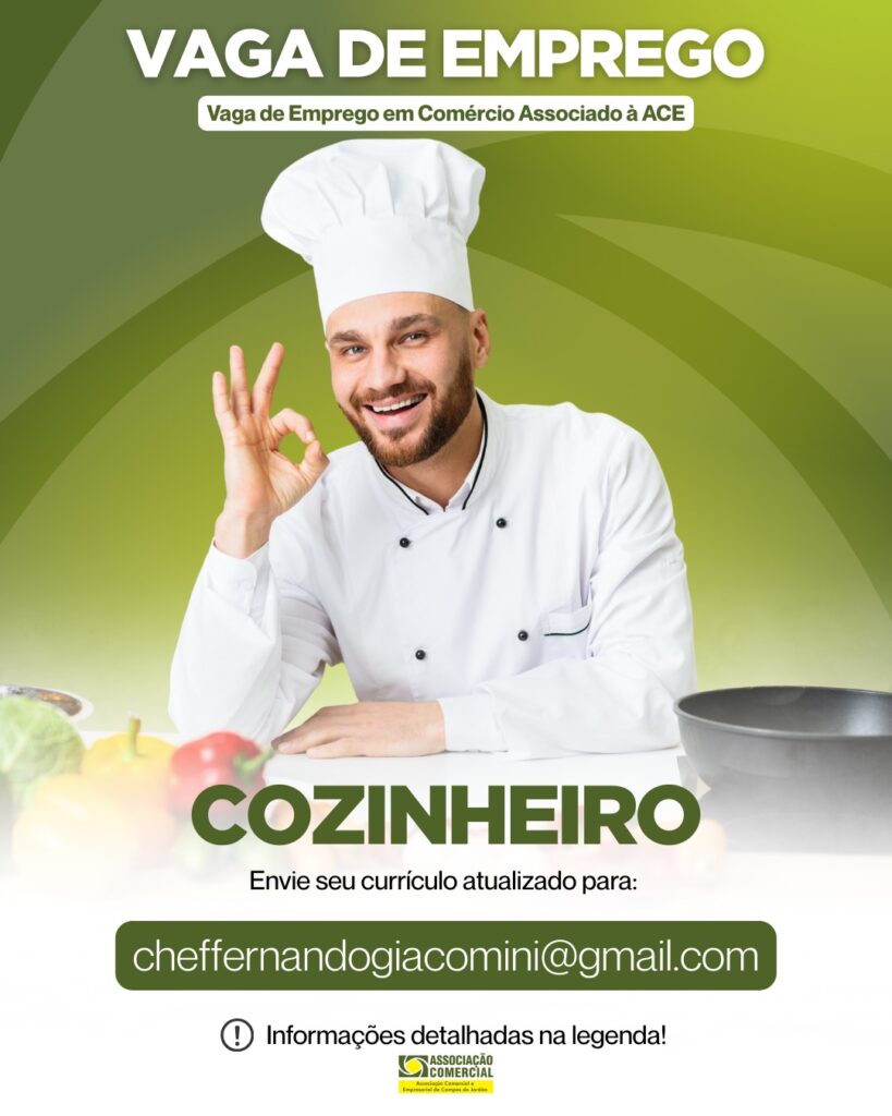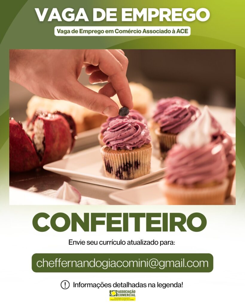 Empresa associada: Hotel ToribaESTÁ CONTRATANDO Vaga de: Confeiteiro Requisitos: Maior de idade Disponibilidade de horário Homem Pontualidade Você se enquadra nesta vaga? Então mande seu currículo atualizado para o E-mail: cheffernandogiacomini@gmail.com Atenção: Os interessados na Vaga deve entrar em contato diretamente com a empresa contratante, a ACE é responsável apenas pela divulgação das vagas das […]