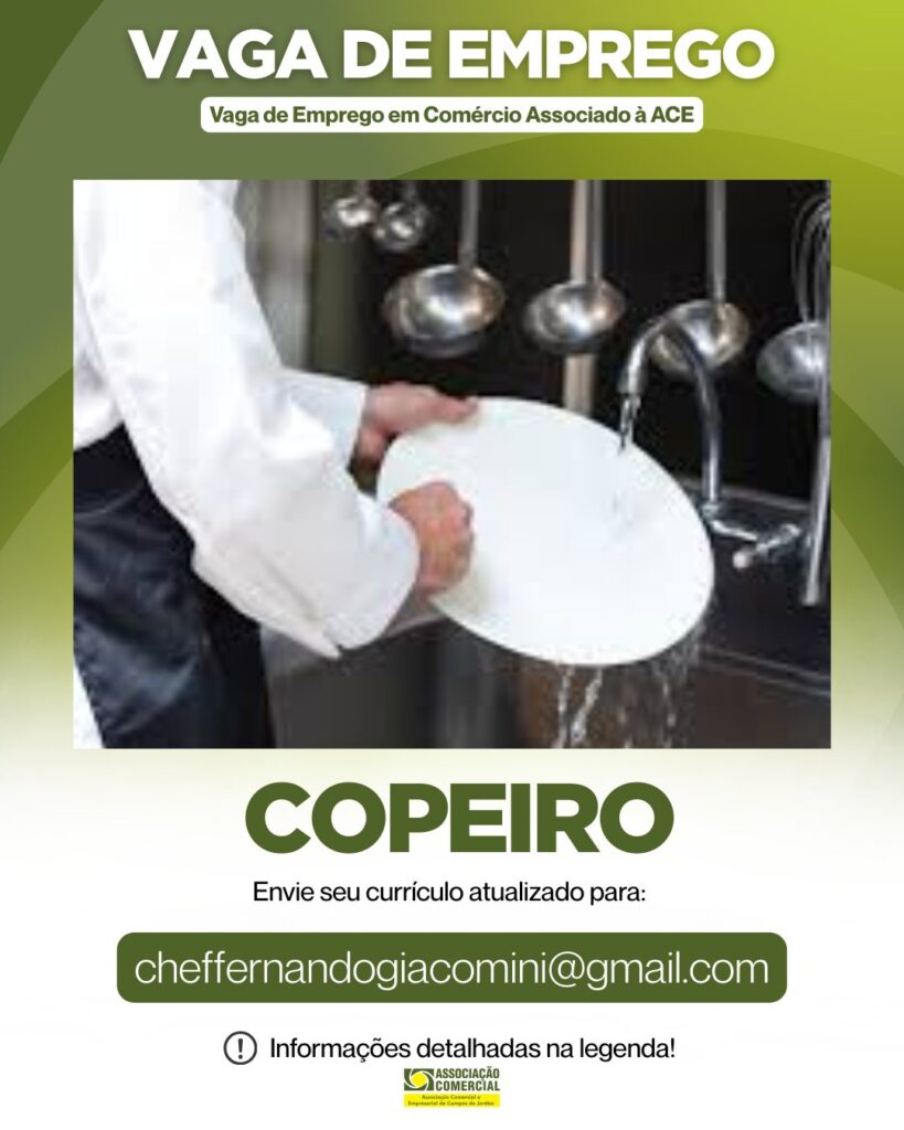 Empresa associada: Hotel ToribaESTÁ CONTRATANDO Vaga de: Copeiro Requisitos: Maior de idade Disponibilidade de horário Homem ou Mulher Pontualidade Você se enquadra nesta vaga? Então mande seu currículo atualizado para o E-mail: cheffernandogiacomini@gmail.com Atenção: Os interessados na Vaga deve entrar em contato diretamente com a empresa contratante, a ACE é responsável apenas pela divulgação das […]