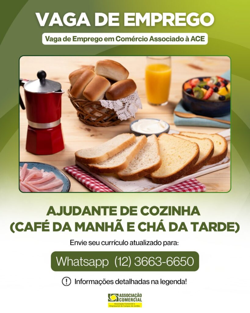 Empresa associada: Pousada La ToscanaESTÁ CONTRATANDO Vaga de: Ajudante de Cozinha (café da manhã e chá da tarde) Requisitos:Experiência básica em cozinha (principalmente com bolos, pães e preparo simples)Noções de higiene e manipulação de alimentosOrganização e limpeza no ambiente de trabalhoCapricho no preparo e apresentação dos alimentosAgilidade e disposição física (montar e repor o buffet […]