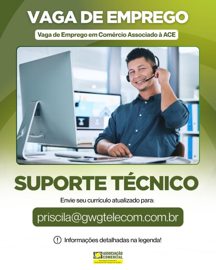 Empresa associada: GWG TelecomESTÁ CONTRATANDO Vaga de: Suporte Técnico / Atendimento Requisitos: Conhecimento básico em informática e redes (domínio de ferramentas essenciais). Organização, responsabilidade e comprometimento com prazos e processos. Experiência prévia em provedores de internet (Diferencial). Conhecimento técnico em roteadores e configuração de rede (Diferencial). Vivência anterior em atendimento ao público ou suporte será […]