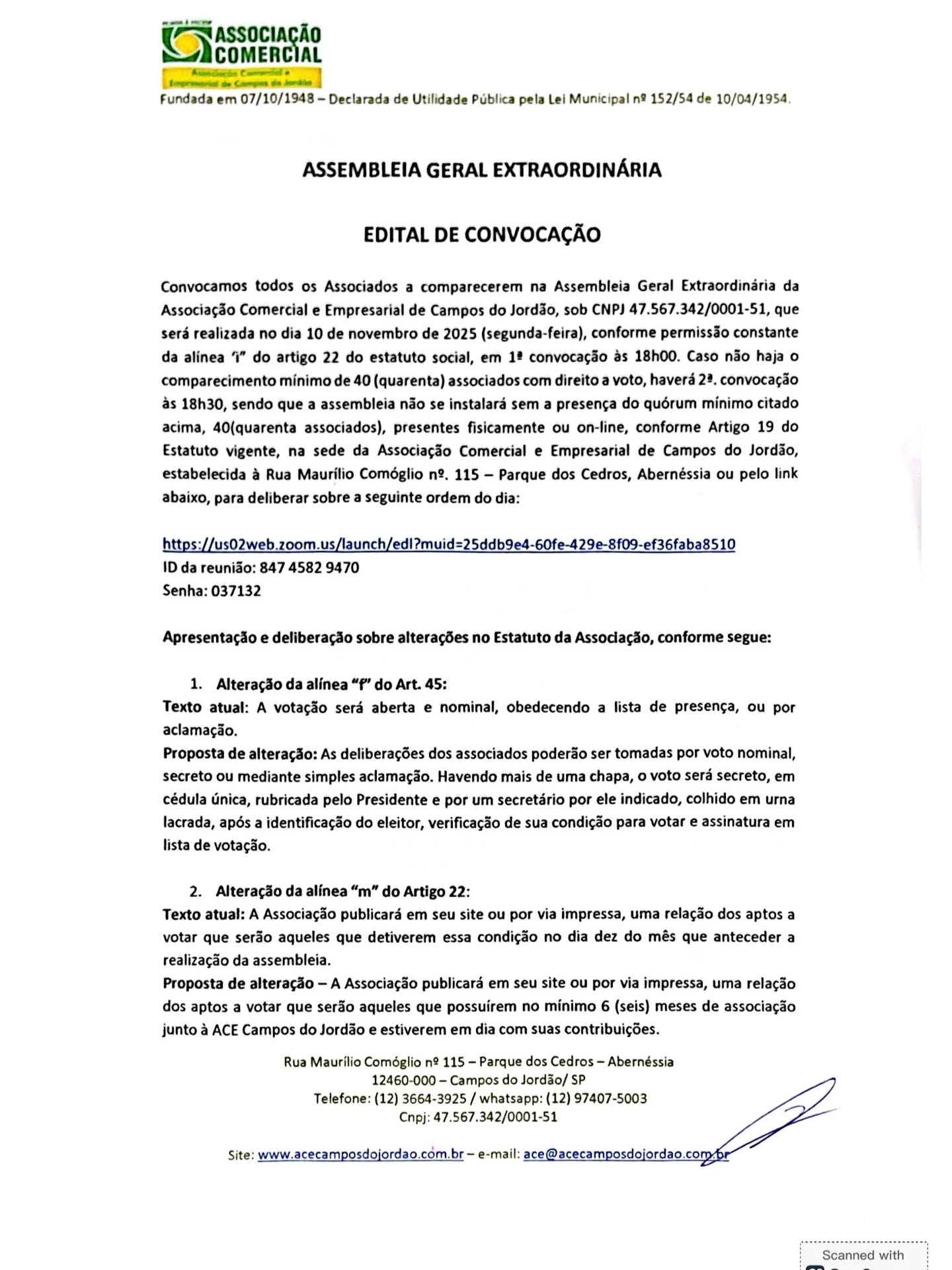 Convocamos os associados da Associação Comercial e Empresarial para a Assembleia Geral Extraordinária, que será realizada no dia 10 de novembro de 2025 (segunda-feira), às 18:00h, em nossa sede da Associação Comercial e Empresarial situada Rua Maurilio Comoglio nº 115 – parque dos cedros – abernéssia