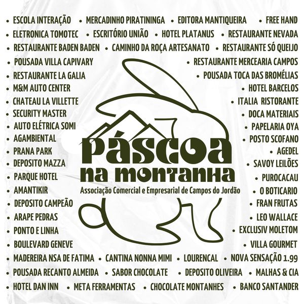 A Associação Comercial de Campos do Jordão vem agradecer todas empresas associadas que aderiram a cota de Comercio Apoiador do projeto Páscoa na Montanha, através de seu apoio foi possível realizar por mais um ano este projeto que é feito com muita dedicação, amor e carinho para a nossa Cidade!