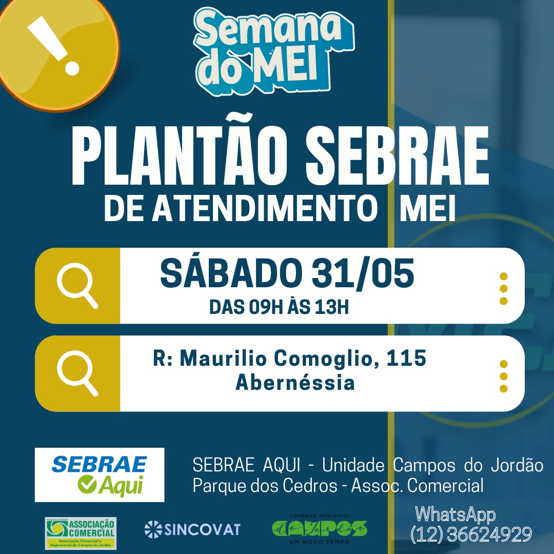 Visando facilitar o cumprimento do prazo final para a entrega da Declaração Anual de Faturamento do MEI (DASN-SIMEI) referente ao ano-calendário de 2024, o SEBRAE Aqui de Campos do Jordão, realizará um plantão de atendimento especial, neste sábado 31 de maio, das 9h às 13h. O atendimento ocorrerá no Parque dos Cedros, ao lado do Polo da Feira, oferecendo suporte personalizado para garantir que sua declaração seja entregue dentro do prazo.
