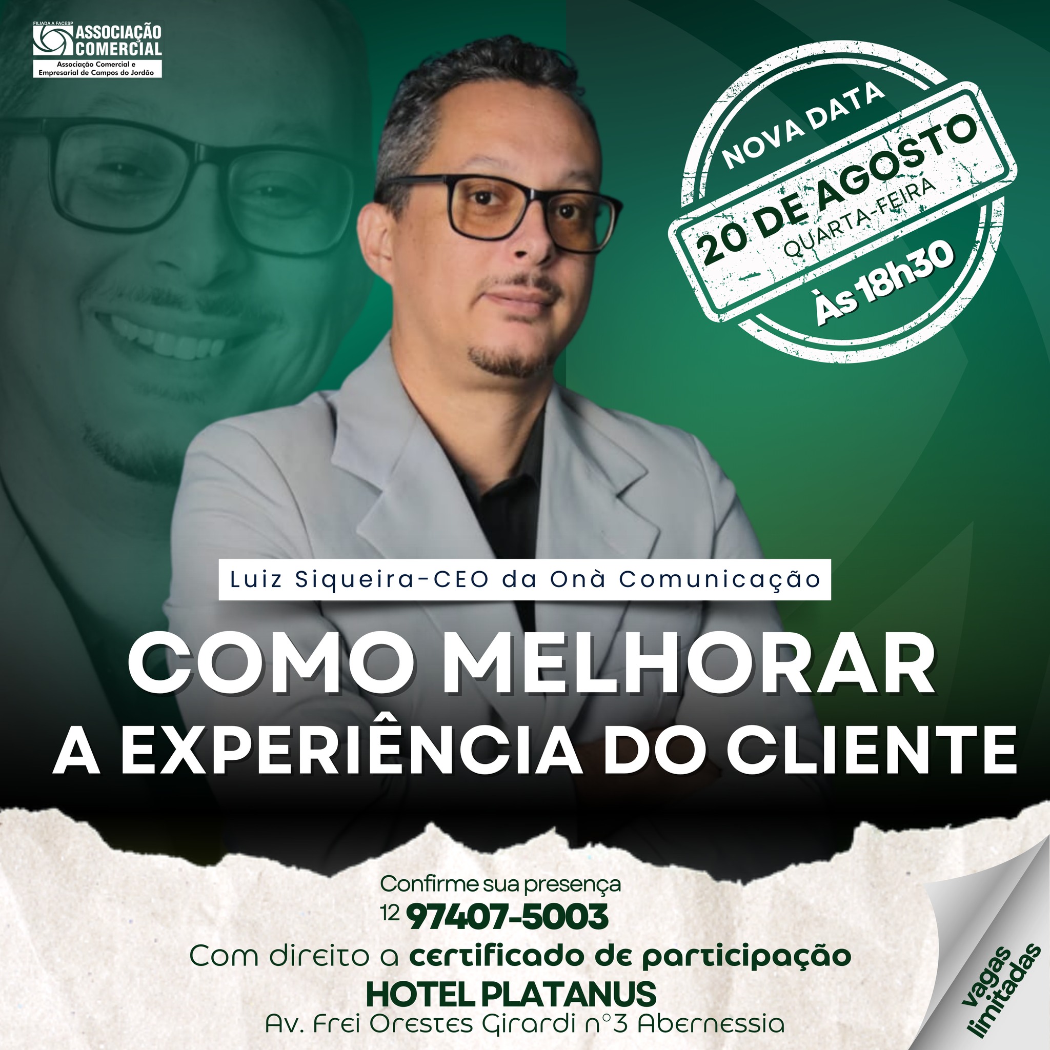 A palestra com Luiz Siqueira, que abordará o tema “Como Melhorar a Experiência com o Cliente”, teve sua data alterada! Agora será no dia 20 de agosto, quarta-feira, mantendo o mesmo horário e local.