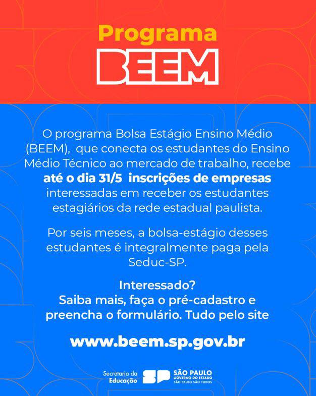 Você, empresário, já pensou em como pode transformar a vida de jovens talentos e fortalecer sua equipe? O Programa BEEM – Bolsa Estágio Ensino Médio conecta empresas da rede estadual de São Paulo a estudantes do Ensino Médio Técnico, oferecendo estágios remunerados.