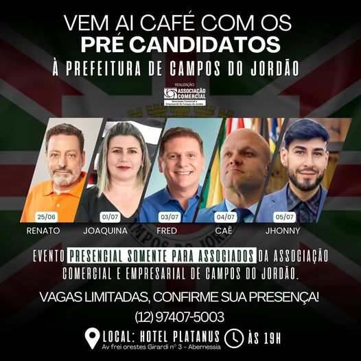 A Associação Comercial e Empresarial de Campos do Jordão convida seus associados para um evento especial: o Café com os Pré-Candidatos à Prefeitura de Campos do Jordão. Esta é a sua chance de conhecer de perto as ideias e propostas de todos os Pré-candidatos que podem moldar o futuro da nossa cidade.