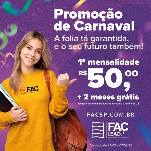 A FAC entrou na folia! Neste Carnaval, a festa é sua e a oportunidade também! Aproveite nossa promoção especial: Graduação ou Pós-Graduação com a 1ª mensalidade por apenas R$ 50,00! E mais: isenção de fevereiro e março – você não paga nada nesses meses! É hora de dar um passo rumo ao seu futuro enquanto […]