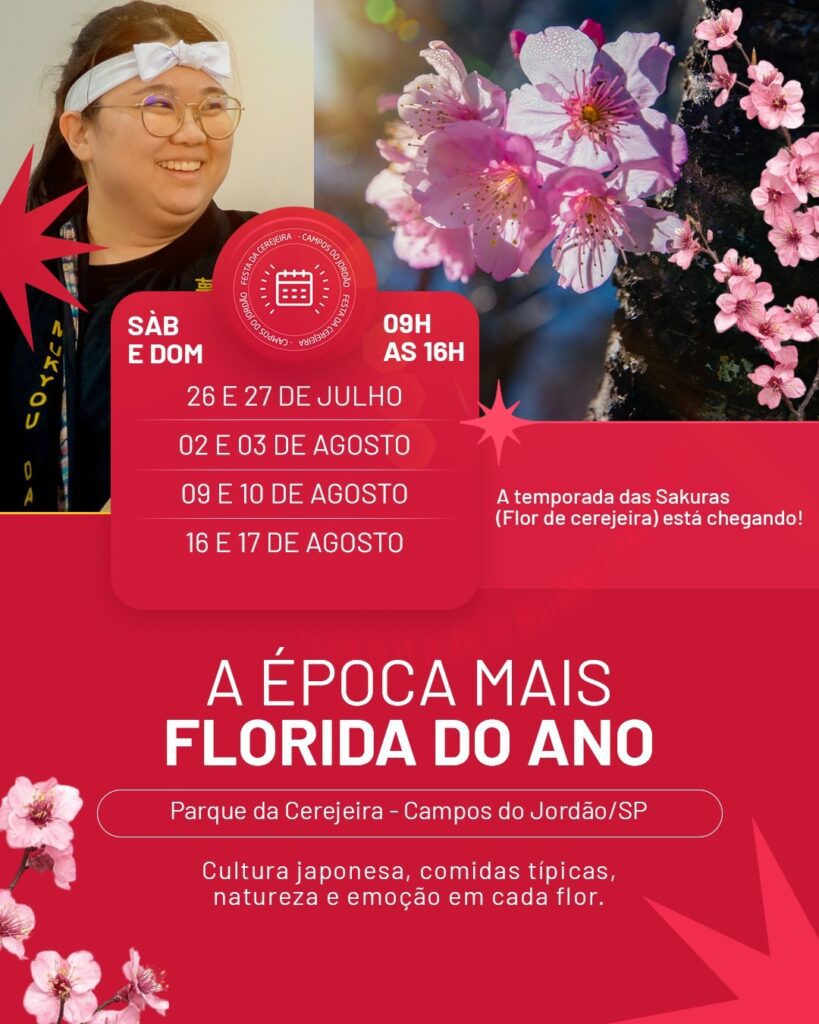 Vem aí a 54ª Festa da Cerejeira em Flor – Campos do Jordão 2025. Um espetáculo de natureza, cultura e solidariedade que transforma o Parque da Cerejeira em um pedacinho do Japão, com gastronomia típica, danças, tambores, trajes tradicionais e a beleza das sakuras em plena flor. Aos sábados e domingos: 26 e 27 de […]