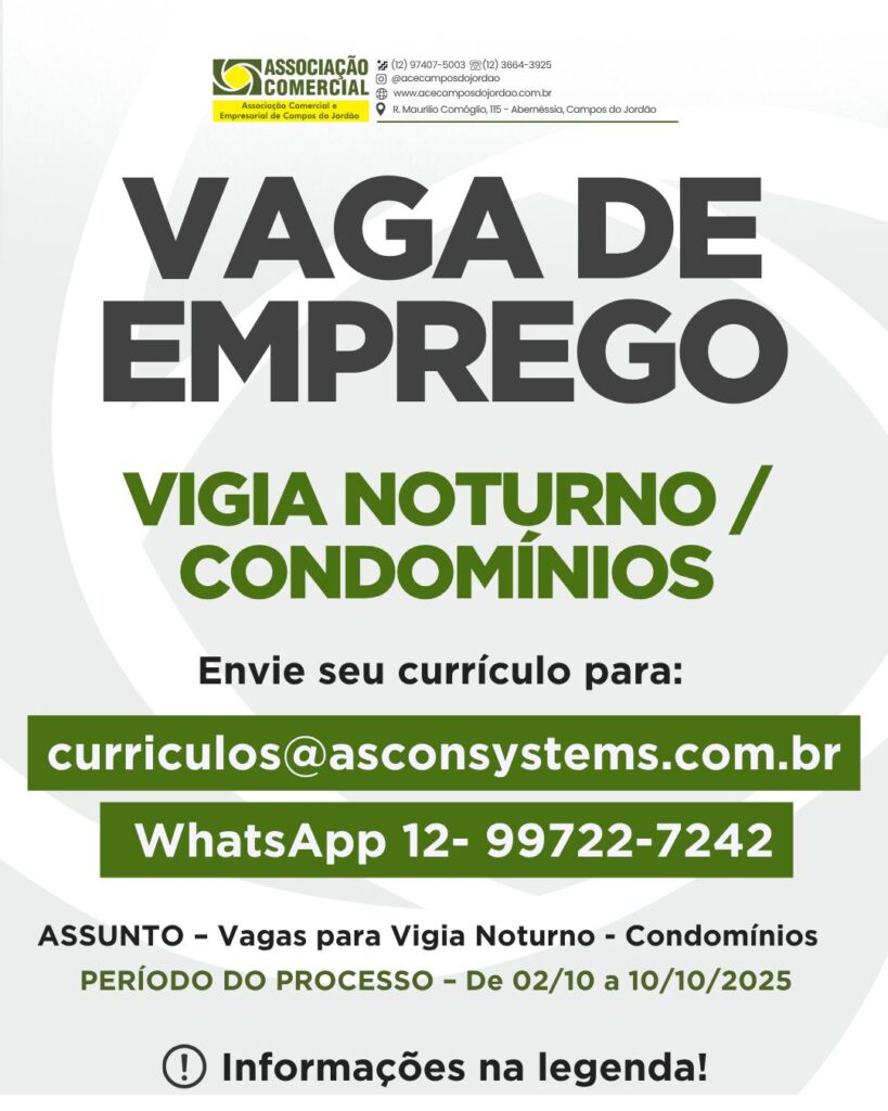 ASCON SYSTEM ESTÁ CONTRATANDO Vagas de: Auxiliar de Manutenção / Condomínio Requisitos: CONHECIMENTOS NECESSÁRIOS – Básico de auxiliar de manutenção Ser receptivo à novos aprendizados Horário de trabalho: Conforme escala 6×1 REMUNERAÇÃO – Piso da categoria BENEFÍCIOS – Salário compatível com mercado, ambiente de trabalho tranquilo. PERÍODO DO PROCESSO – De 02/10 a 10/10/2025 Você […]