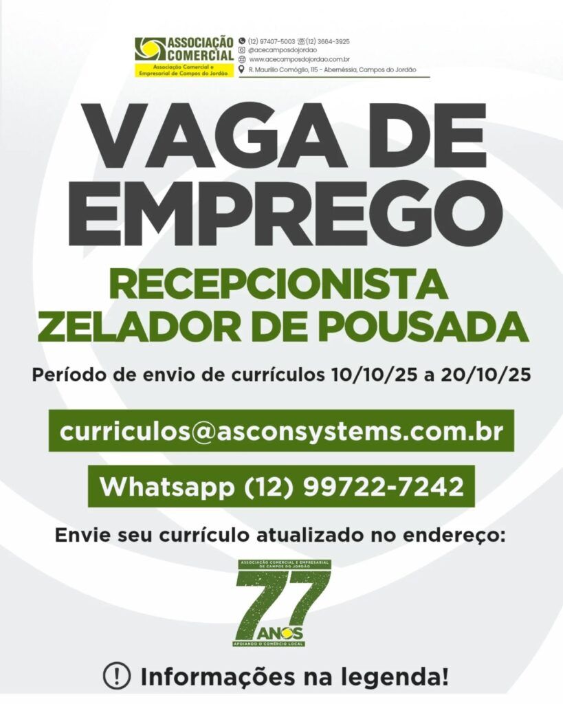 Empresa associada: Ascon Systems ESTÁ CONTRATANDO Vaga de: Recepcionista / Zelador de Pousada Requisitos: Ensino médio completo; Desejável experiência prévia em recepção, hotelaria ou manutenção predial; Conhecimentos básicos em informática (Word, Excel e WhatsApp Business); Noções gerais de elétrica, hidráulica e jardinagem; Boa comunicação verbal e escrita. *Enviar os curriculos de 10/10/2025 á 20/10/2025* Você […]