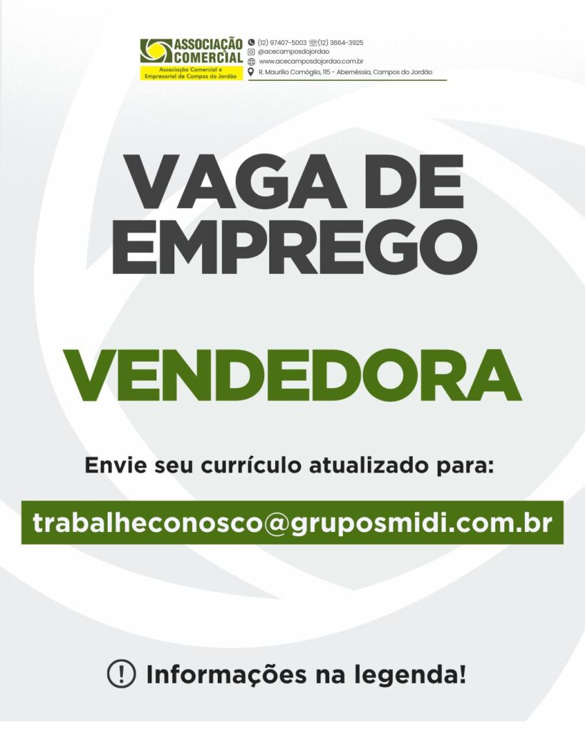 Empresa associada: Chocolate Montanhês ESTÁ CONTRATANDO Vaga de: Balconista Requisitos: maior de 18 anos Carga horária de 44horas semanais, folga de acordo com escala Você se enquadra nesta vaga? Então mande seu currículo atualizado para o E-mail: administrativo@chocolatemontanhes.com.br ou pelo whats 12 99779-1654 Atenção: Os interessados na Vaga deve entrar em contato diretamente com a […]