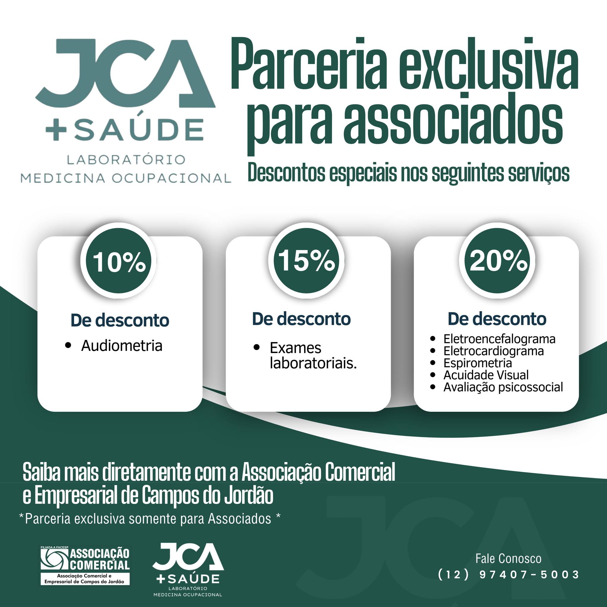A Associação Comercial e Empresarial de Campos do Jordão tem o prazer de anunciar uma parceria especial com o JCA + Saúde Laboratório Medicina Ocupacional. Esta parceria oferece descontos exclusivos para nossos associados em diversos serviços de saúde.