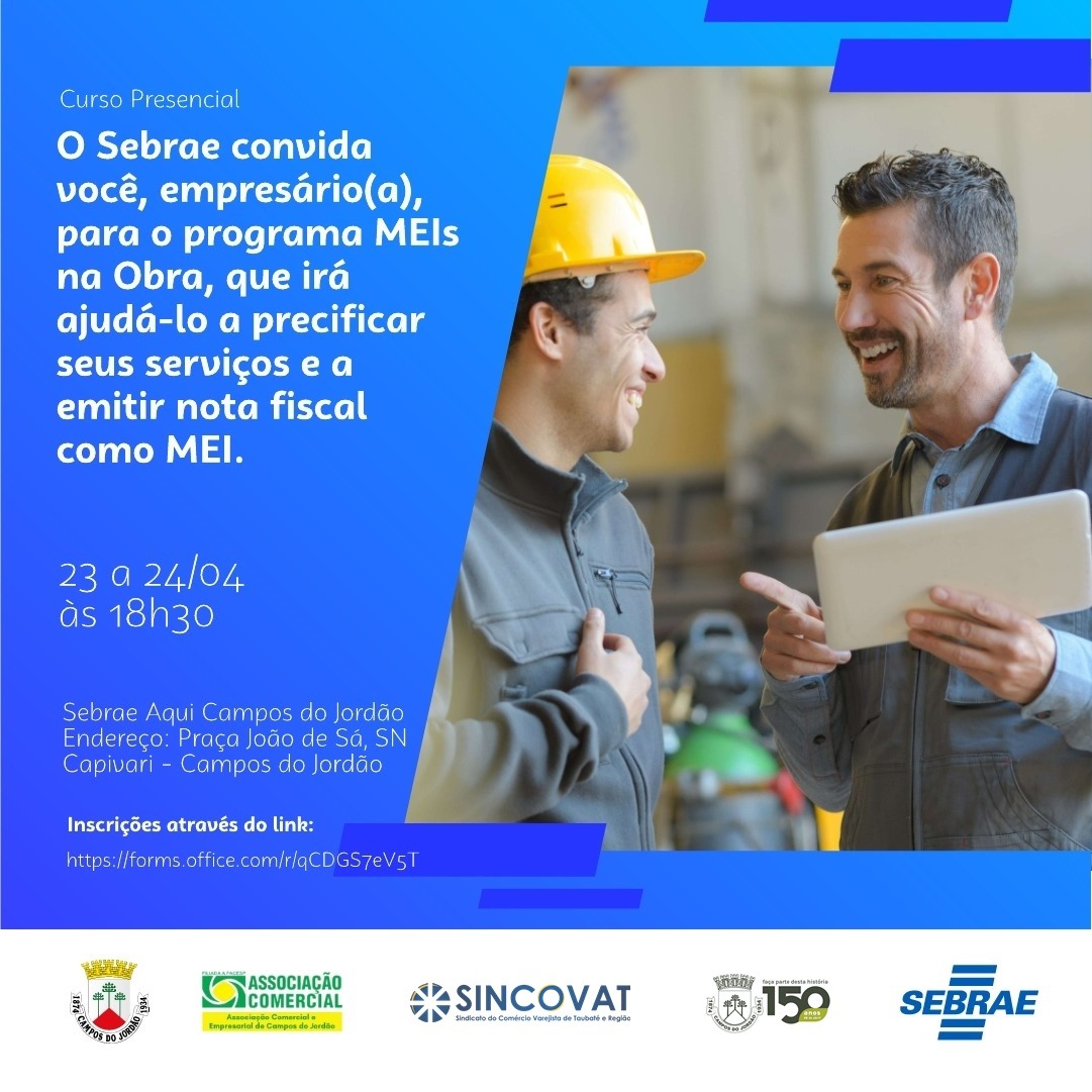 ATENÇÃO você, empresário(a) da Construção Civil, O SEBRAE preparou uma trila especial para ajuda-lo a alavancar seu faturamento! Vem ai o Programa “MEIs Na Obra”, com dois encontros, onde iremos ajudá-lo aprender a precificar seus serviços e a emitir Nota Fiscal de serviço como MEI.