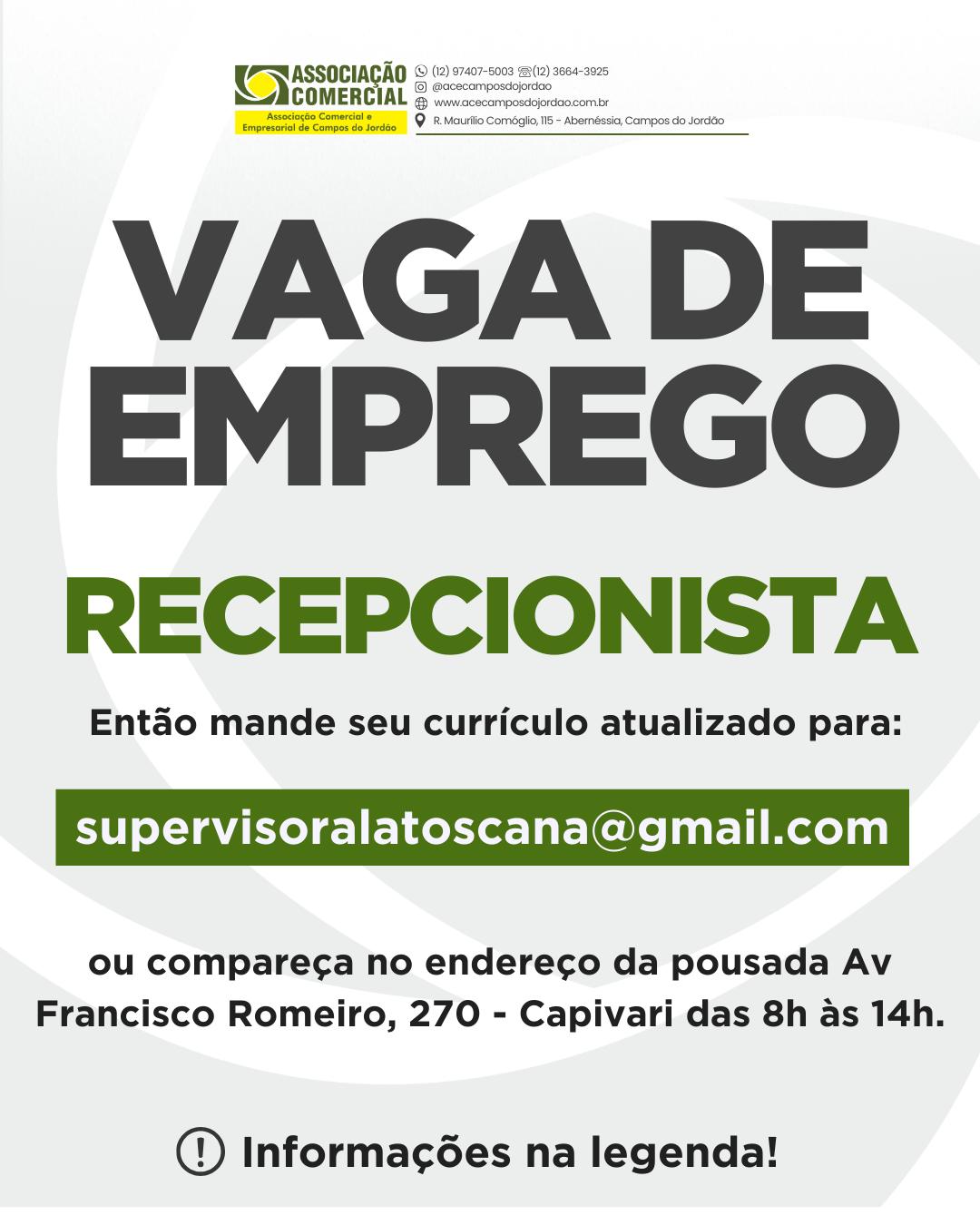 Então mande seu currículo atualizado para o e-mail: supervisoralatoscana@gmail.com ou compareça no endereço da pousada Av Francisco Romeiro, 270 – Capivari das 8h às 14h.
