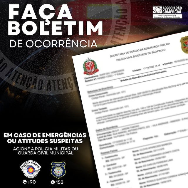 Conforme pedido das autoridades policiais, a Associação Comercial e Empresarial de Campos do Jordão solicita a todos os empresários da cidade , o registro de boletim de ocorrencia em todos os casos relacionados a pequenos furtos e roubos no comércio local . Isto possibilitará maior efetividade no trabalho de policiamento e prevenção. Vale destacar que videos e imagens que sao postadas em redes sociais com este tema, servem como alerta a população e tem sim sua grande repercussão porém não é valida como registro para que as autoridades tomem as medidas necessárias para a sua proteção e de seu comércio.